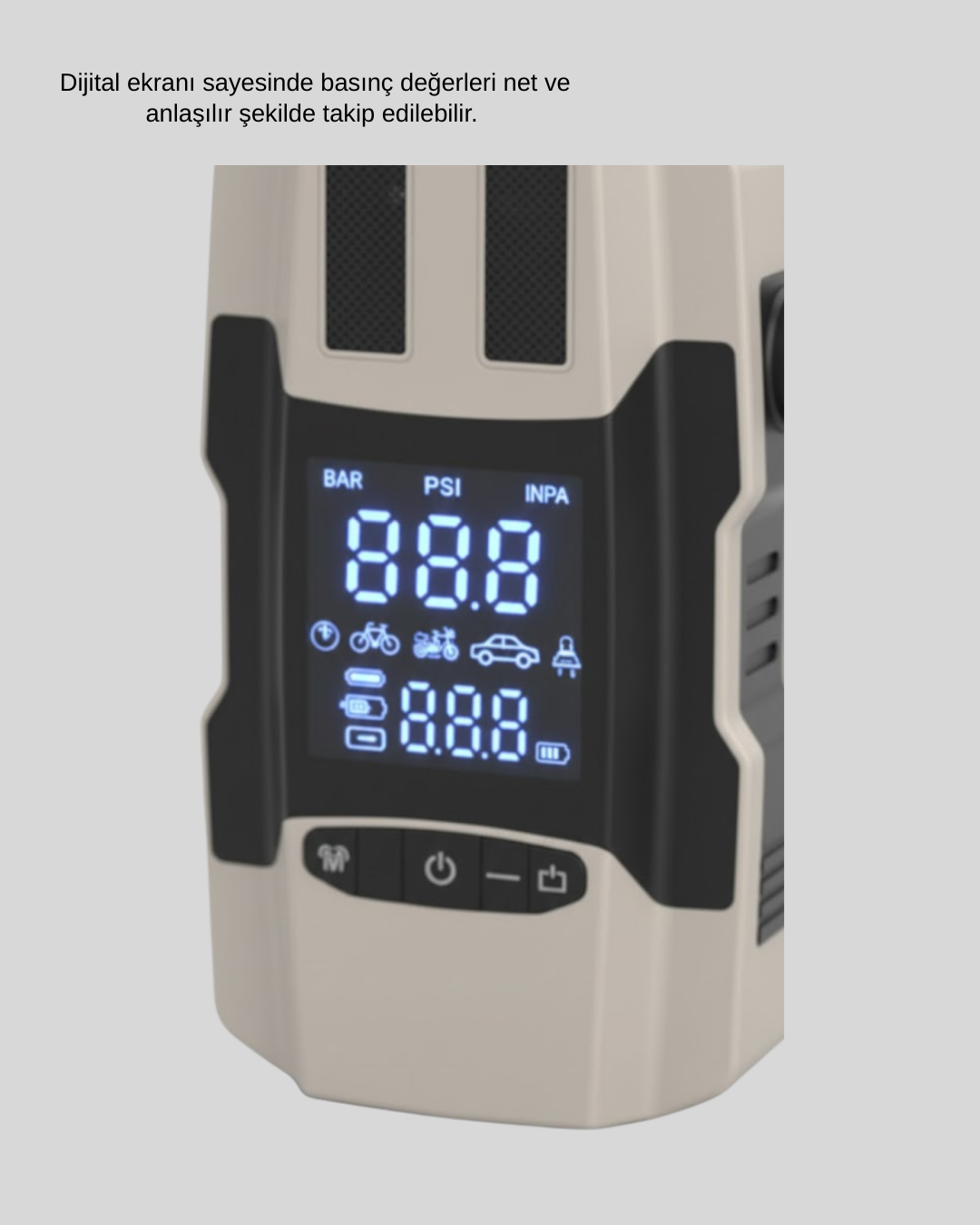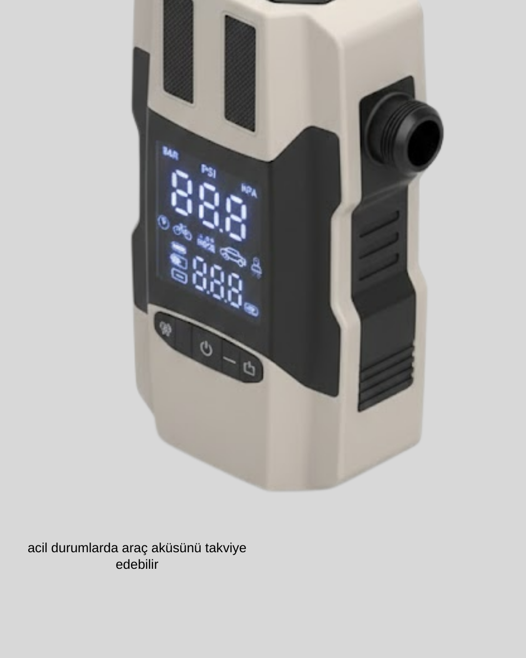 Araç kullanıcıları için geliştirilen bu cihaz, yolculuk sırasında karşılaşılabilecek acil durumlar için ideal bir yardımcıdır. Entegre lastik şişirme pompası sayesinde manuellere ihtiyaç duymazsınız. Akü takviye özelliği, zayıflamış aküleri çalıştırmaya yardımcı olur. 12.000 mAh batarya kapasitesi ile telefon ve diğer elektronik cihazlar powerbank olarak şarj edilebilir. Dijital gösterge, kullanım sırasında hassas kontrol sağlar.