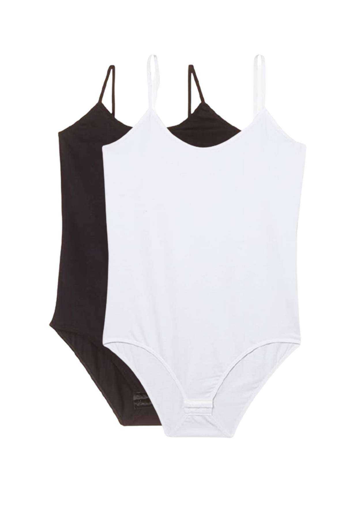 2 Adet Battal Beden İp Askılı Kadın Çıtçıtlı Body Siyah Beyaz