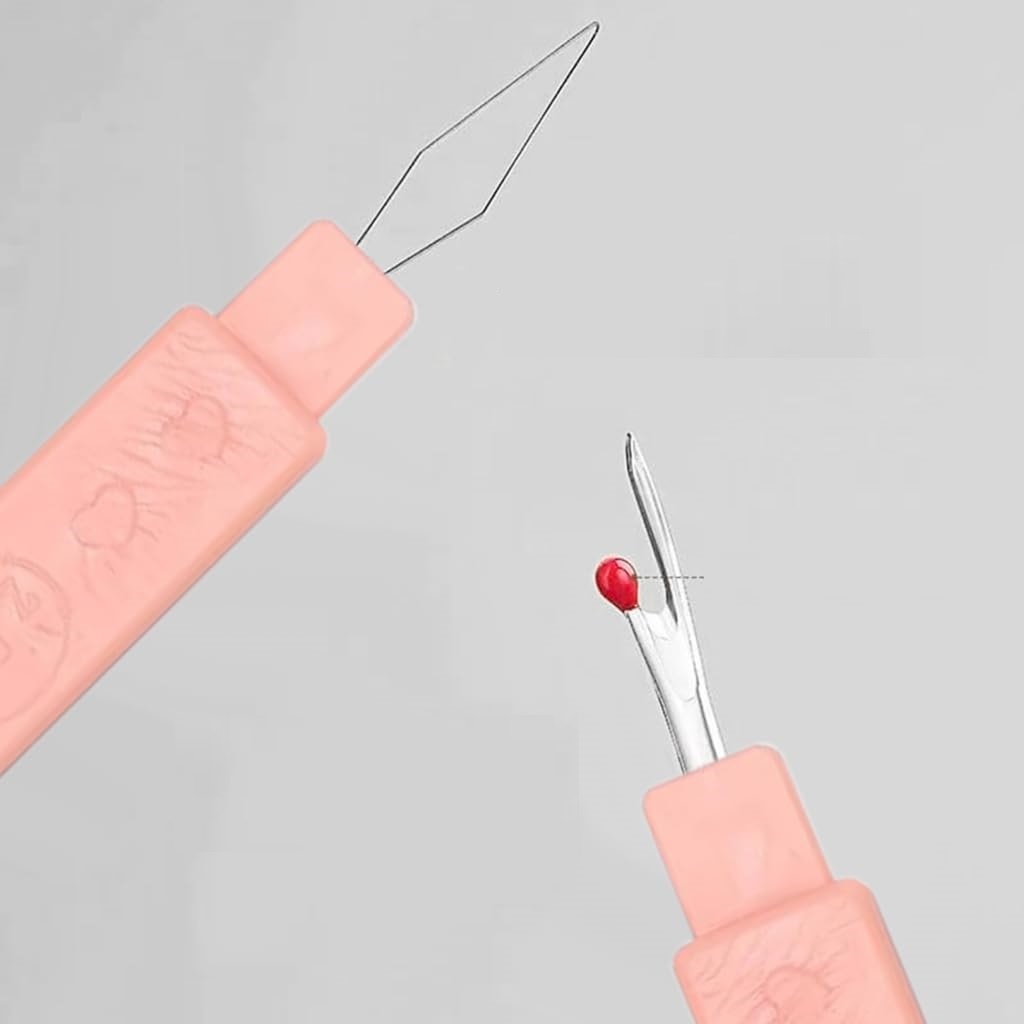 2'Sİ 1 ARADA İĞNEYE İPLİK AÇICI: Bu yenilikçi iğneye iplik geçirici, iki temel işleve hizmet eden çift uçlu bir tasarıma sahiptir. Bir ucundaki ince metal kanca, çeşitli iplik boyutlarına uyum sağlayarak iğnelere olağanüstü kolaylıkla iplik geçirilmesini kolaylaştırır. Diğer uçta yerleşik bir iplik kesici bulunur, bu da makasa uzanma ihtiyacını ortadan kaldırır ve böylece dikiş sürecini kolaylaştırır.