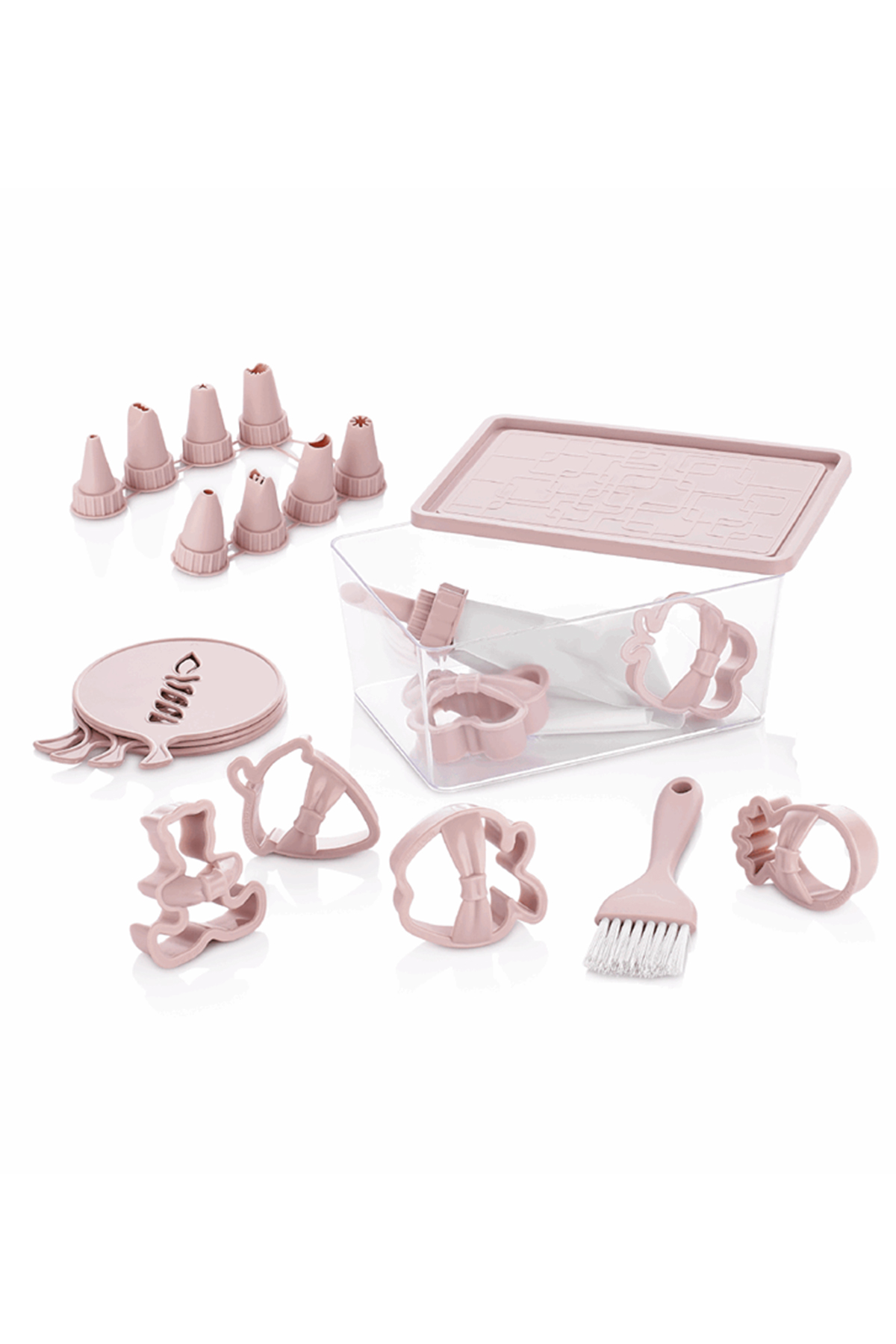 kutu İçeriği : Krema Torbası Şekilli Kapaklar Kurabiye Kalıpları Süsleme Şablonları Yumurta Fırçası Saklama Kabı