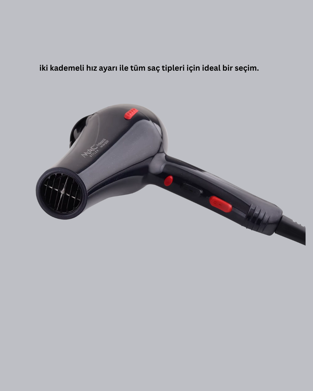 2200 Watt Profesyonel Saç Kurutma Makinesi, güçlü AC motoru sayesinde yüksek performans ve hızlı kurutma deneyimi sunar. Kuaför salonlarında kullanılan profesyonel seviyedeki motor yapısı, hava akışını daha güçlü ve istikrarlı hale getirerek kısa sürede etkili sonuç almanızı sağlar. İki kademeli hız ayarı ve sıcak-soğuk üfleme seçenekleri ile her saç tipine uygun kişiselleştirilmiş kullanım imkânı sunar. İnce telli saçları nazikçe kurutabilir, kalın ve yoğun saçları hızlı bir şekilde şekillendirebilirsiniz.Cihazın ergonomik ve hafif tasarımı, uzun süreli kullanımlarda bile elinizi yormaz. Profesyonel kullanıcılar için tasarlanmış olsa da ev kullanımında da büyük kolaylık sağlar. Taşınabilir yapısı sayesinde seyahatte, tatilde veya iş yerinde rahatça kullanılabilir. Uzun ömürlü dayanıklı malzemelerden üretilmiş gövde yapısı ile darbelere karşı ekstra koruma sağlar ve uzun yıllar boyunca sorunsuz performans sunar.Sıcak üfleme ayarı saçlarınızı hızlıca kuruturken, soğuk üfleme fonksiyonu saç modelinizi sabitlemenize yardımcı olur. Bu özellik hem saç şekillendirme işleminde profesyonel sonuçlar almanızı sağlar hem de saç sağlığının korunmasına destek olur. Güçlü hava akımı, saçın parlaklığını ve hacmini artırarak daha dolgun bir görünüm ortaya çıkarır.Cihazın dar ağızlı başlık aparatı, şekillendirme sırasında kontrollü hava akışı sağlar. Bu sayede fön işlemi daha hızlı, kolay ve etkili hale gelir. Motor yapısının sessiz çalışması günlük kullanımda konforu artırır. Hem bireysel kullanıcılar hem de profesyoneller için mükemmel bir tercih olan bu 2200W saç kurutma makinesi, yüksek performansı, dayanıklılığı ve ergonomik tasarımı ile beklentilerin üzerinde bir deneyim sunar.