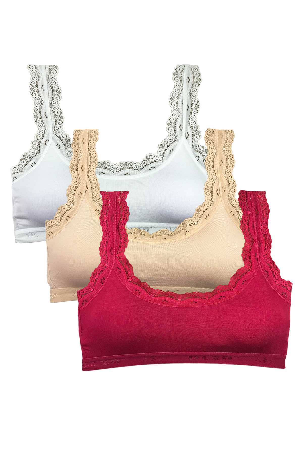 3 Adet Dantel Nakış İşlemeli Pedli Bambu Kadın Büstiyer Beyaz Ten Bordo