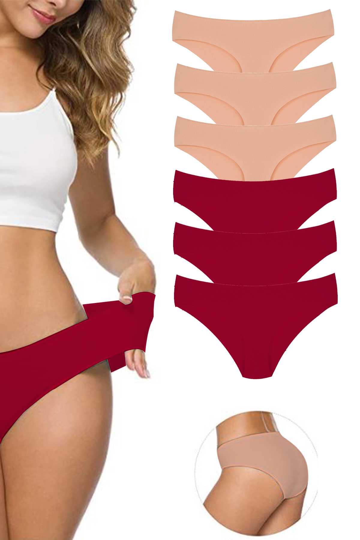 6 Adet Kadın Dikişsiz Lazer Kesim Esnek İz yapmayan Külot Ten Bordo