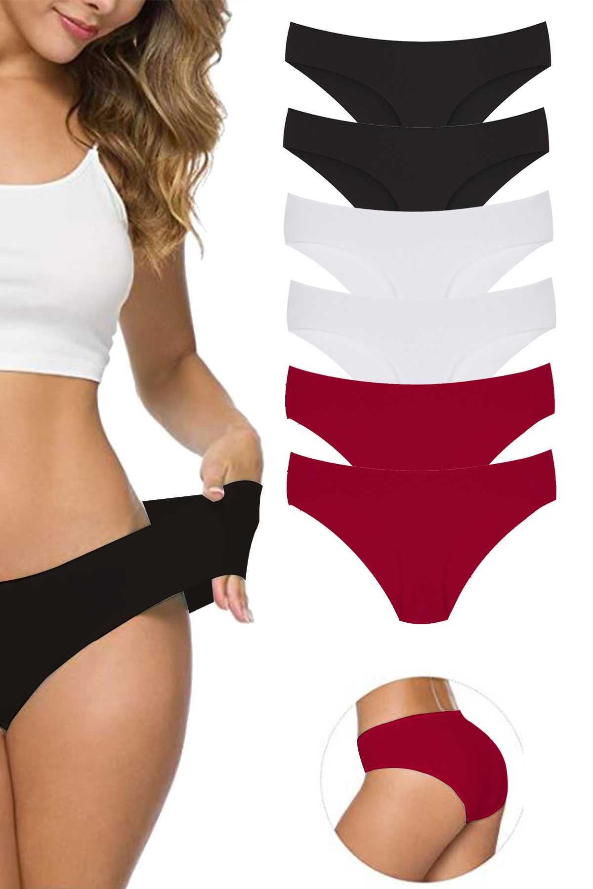 6 Adet Kadın Dikişsiz Lazer Kesim Esnek İz yapmayan Külot Siyah Beyaz Bordo