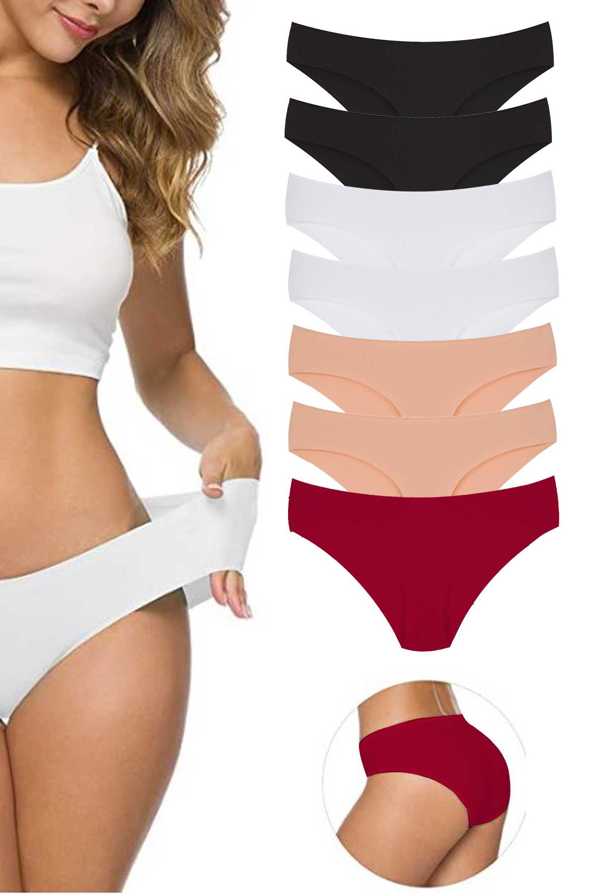 7 Adet Kadın Dikişsiz Lazer Kesim Esnek İz yapmayan Külot Siyah Beyaz Ten Bordo
