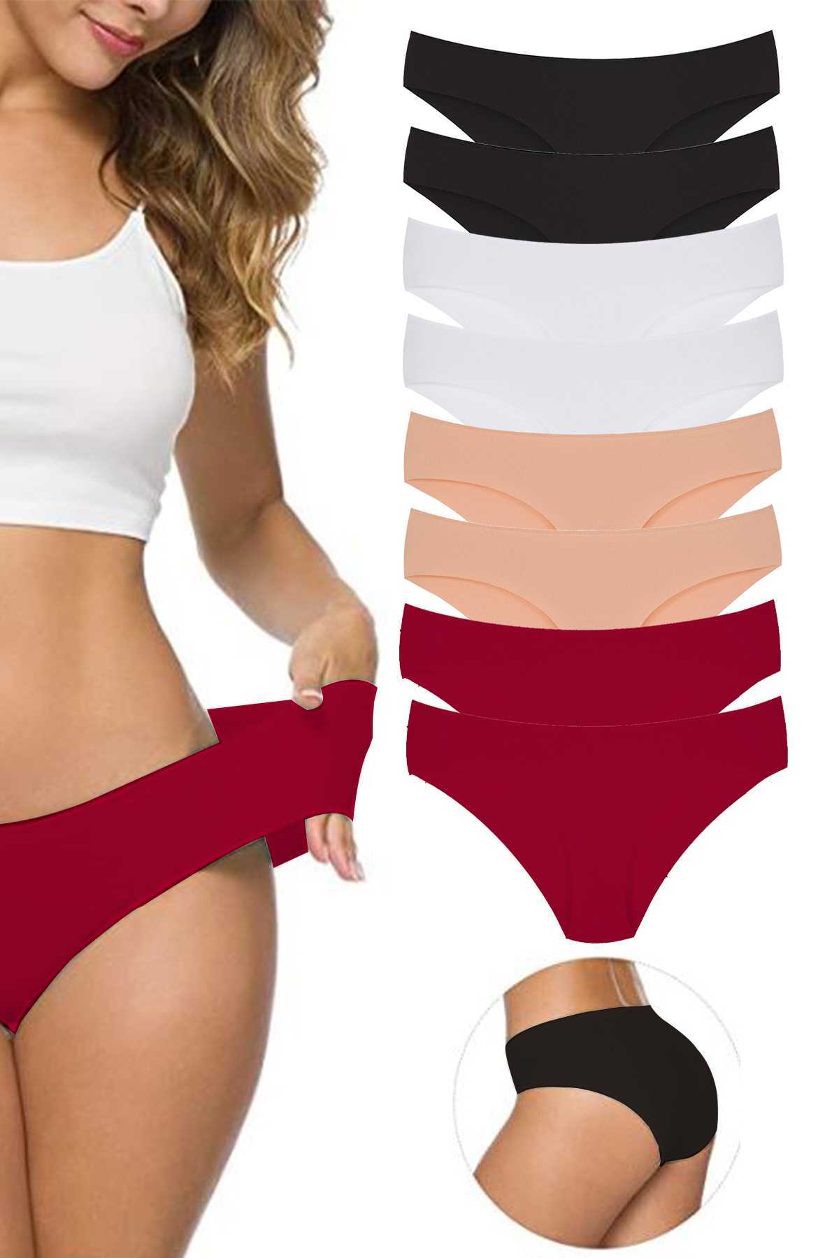 8 Adet Kadın Dikişsiz Lazer Kesim Esnek İz yapmayan Külot Siyah Beyaz Ten Bordo