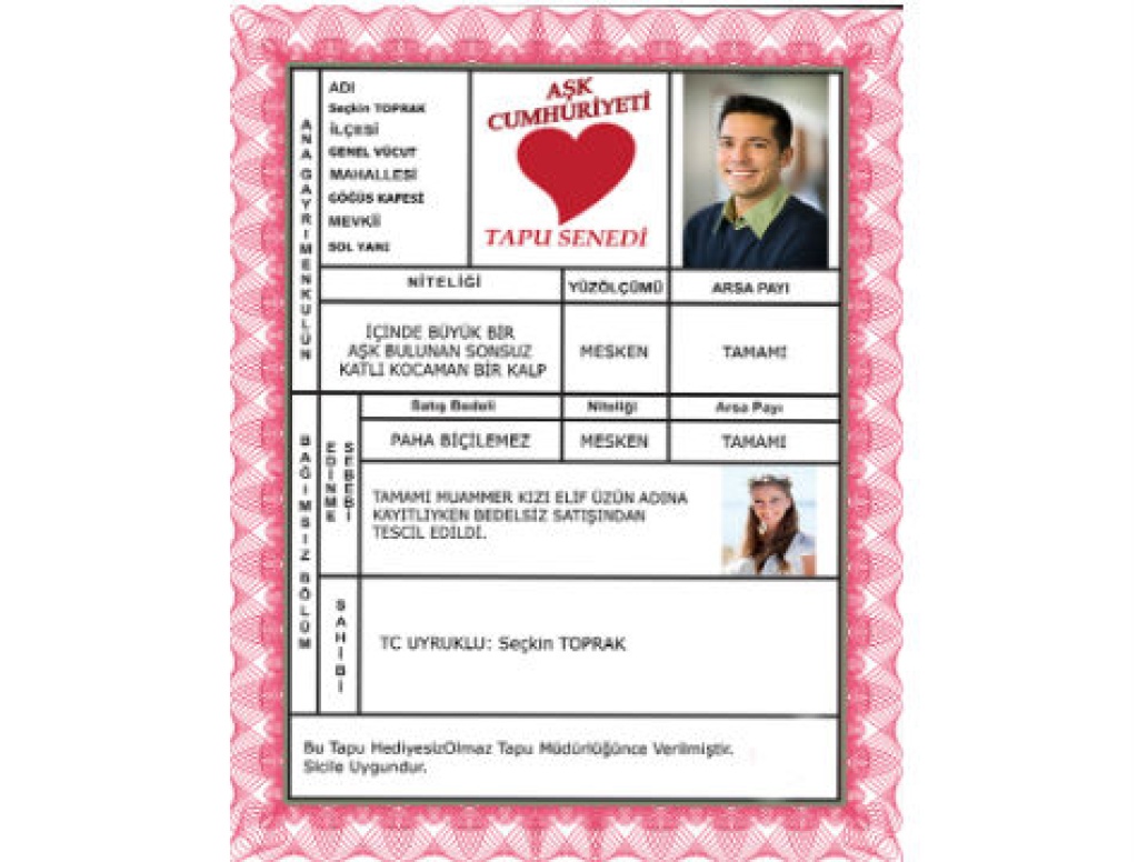 Aşk Cumhuriyeti nin en romantik müdürlüklerinden biri olan Aşk Tapusu Müdürlüğü tarafından düzenlenen bu yüz ölçümü sonsuz, değeri paha biçilemez Aşk Tapunuzu sevgilinize tescil ettirip vermeniz çok artık çok kolay!