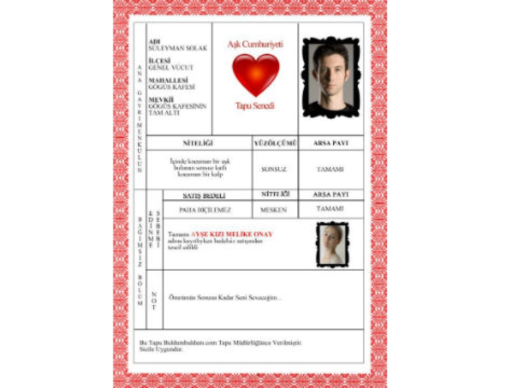 Aşk Tapusundaki sağ en üstteki resim yerine kalbinizi verdiğiniz sevgilinizin resmini ekleyerek sevgilinize tapusunu teslim edebilirsiniz.
