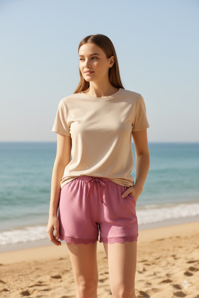 Bambu Fitilli Kadın Ev Şortu Bacak Dantel Detaylı Ev Giyim Fuşya