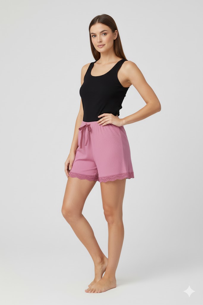 Bambu Fitilli Kadın Ev Şortu Bacak Dantel Detaylı Ev Giyim Pembe