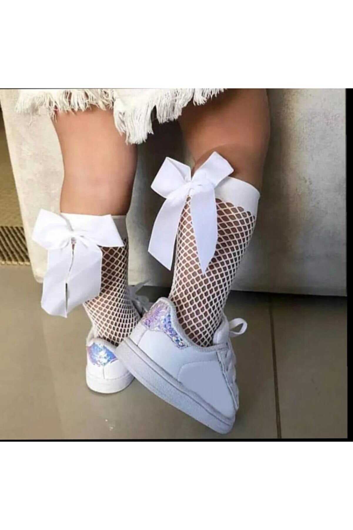 Beyaz Fileli Diz Altı Fiyonklu Kız Çocuk Çorap