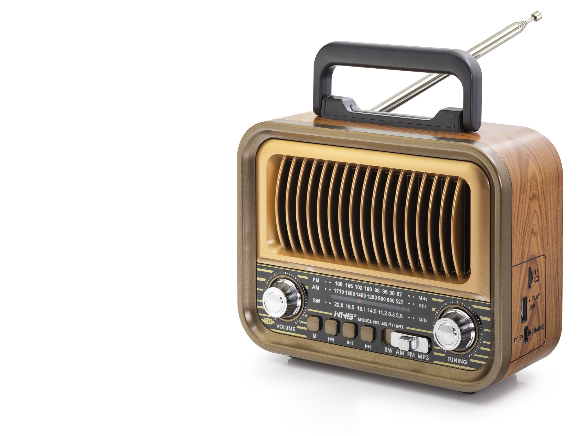 NS7110BT, Klasik Radyo Estetiğini Modern Dijital İmkanlarla Birleştiren, 20 Cm Genişliğinde Kompakt Ve Şık Bir Nostaljik Ses Sistemidir. Ahşap Dokulu Zarif Kasası, Dikey Ön Izgara Tasarımı Ve Üst Kısımdaki Ergonomik Taşıma Kulbuyla Bulunduğu Her Ortama Vintage Bir Hava Katarken, Güncel Bluetooth Teknolojisiyle Yüksek Kaliteli Müzik Deneyimi Sunar.