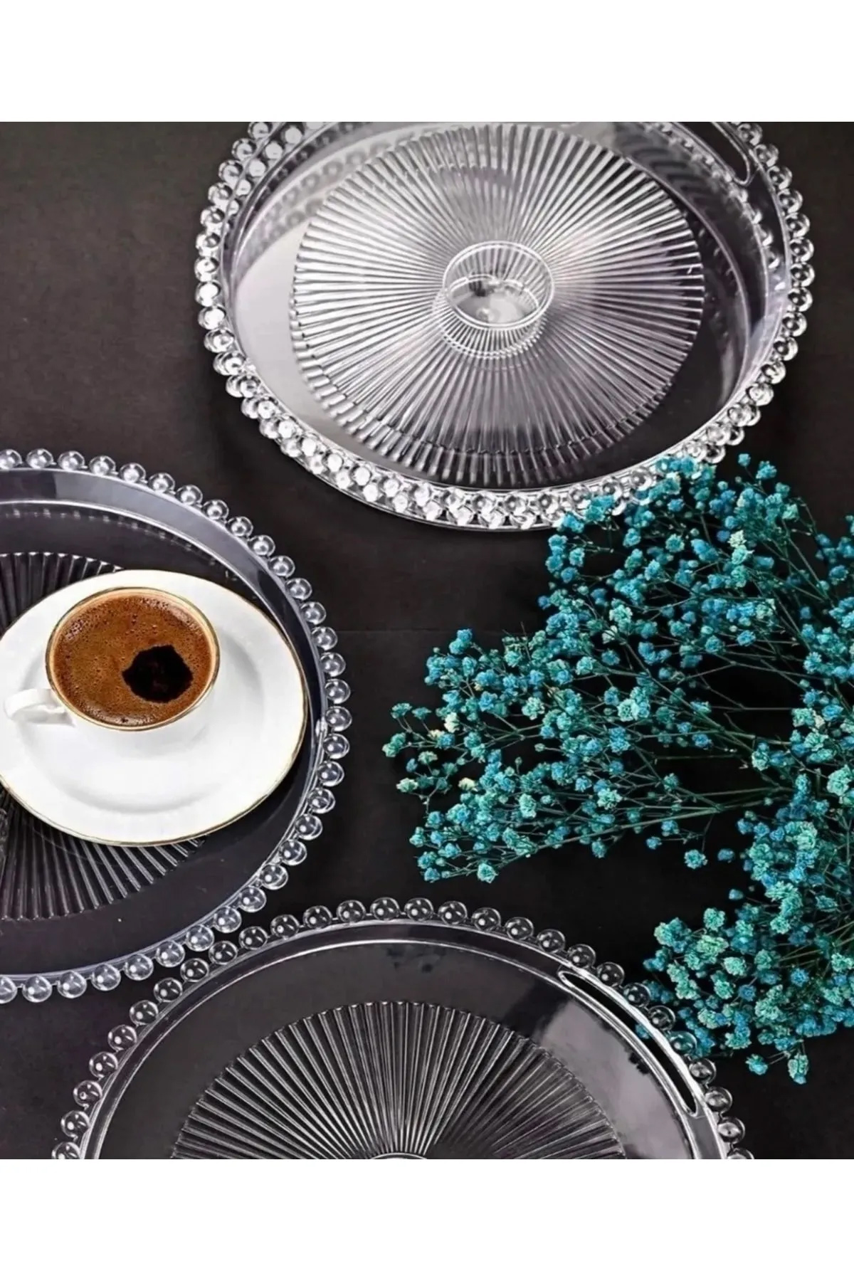 | Boncuklu Sunum Tepsisi, Şeffaf Tepsi, Çay Tepsisi, Sunumluk 23 Cm |