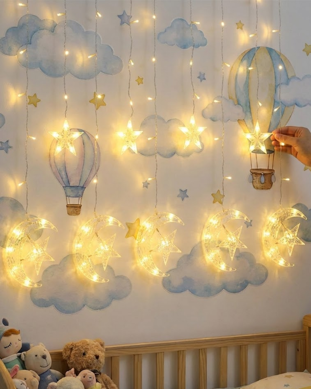 Hilal ve yıldız figürlü bu ışık zinciri, zarif detayları ve ince işçiliğiyle dikkat çeker. Figürlerin tasarımı sade ama etkileyici bir görünüme sahiptir. Mekâna yerleştirildiğinde dekorun merkez noktası haline gelir.Yüksek kaliteli plastik malzeme ve PVC kaplamalı kablo yapısı sayesinde hem sağlam hem de güvenlidir. Isıya dayanıklı yapısı sayesinde uzun süreli kullanımlarda performans kaybı yaşanmaz. Güvenli tasarım anlayışı ile üretilmiştir ve dekoratif kullanım için uygundur.Sabit ve yanıp sönen iki farklı ışık modu sayesinde kullanım amacınıza göre tercih yapabilirsiniz. Ev dekorasyonundan organizasyon süslemelerine kadar geniş bir kullanım alanı sunar.Salon, yatak odası, çocuk odası, balkon, restoran ve vitrin dekorasyonlarında rahatlıkla kullanılabilir. Özellikle loş ortamda verdiği sıcak ışık, mekânı daha davetkâr ve huzurlu hale getirir.