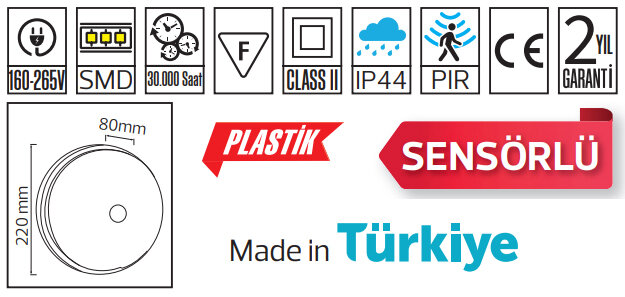 Horoz Elektrik Bolkar Ledli Sensörlü Armatür ÖzelliklerVolt: 160-265V / 50-60HzWatt: 20WLümen: 2400 lmIşık Rengi: 6400KÜrün Rengi: Beyaz / SiyahLED Tipi: SMD LEDIşık Ömrü: 30,000 saatUzunluk: Ø220×80 mmAçıklama: PIR Sensörlü