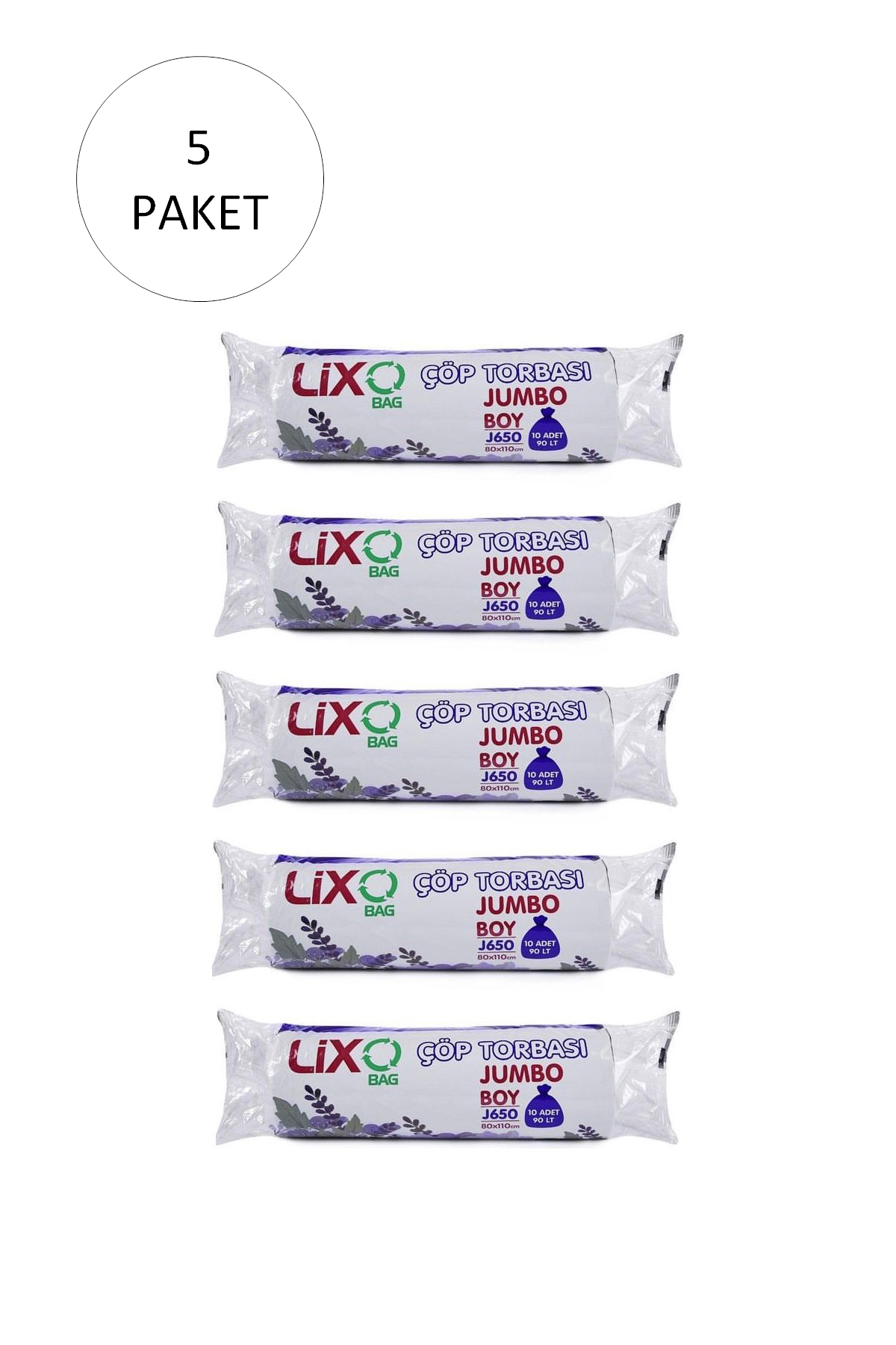 -Paket İçeriği :  -J-650 Jumbo Boy Çöp Torbası 80 x 110 cm 10 Lu Rulo x 5 Paket = 50 Adet (Siyah)