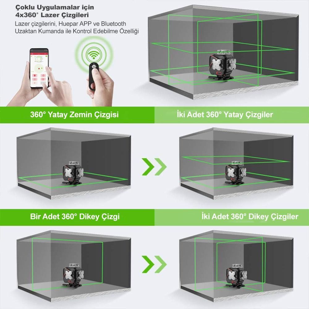 Dört adet 360⁰ çizgi lazer ile oluşan 10 noktadan artı lazer hattı ile son derece net görünürlüğe sahip LCD Ekranlı uzaktan kontrol edilebilir Yeşil lazer hizalama.