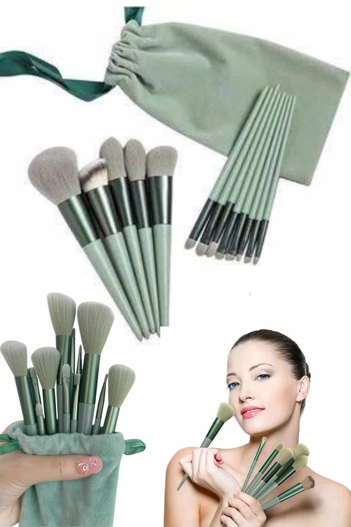 Makyaj Fırça Seti Yeşil 13 Parça Fondöten Fırçası Allık Fırçası Far Fırçası
