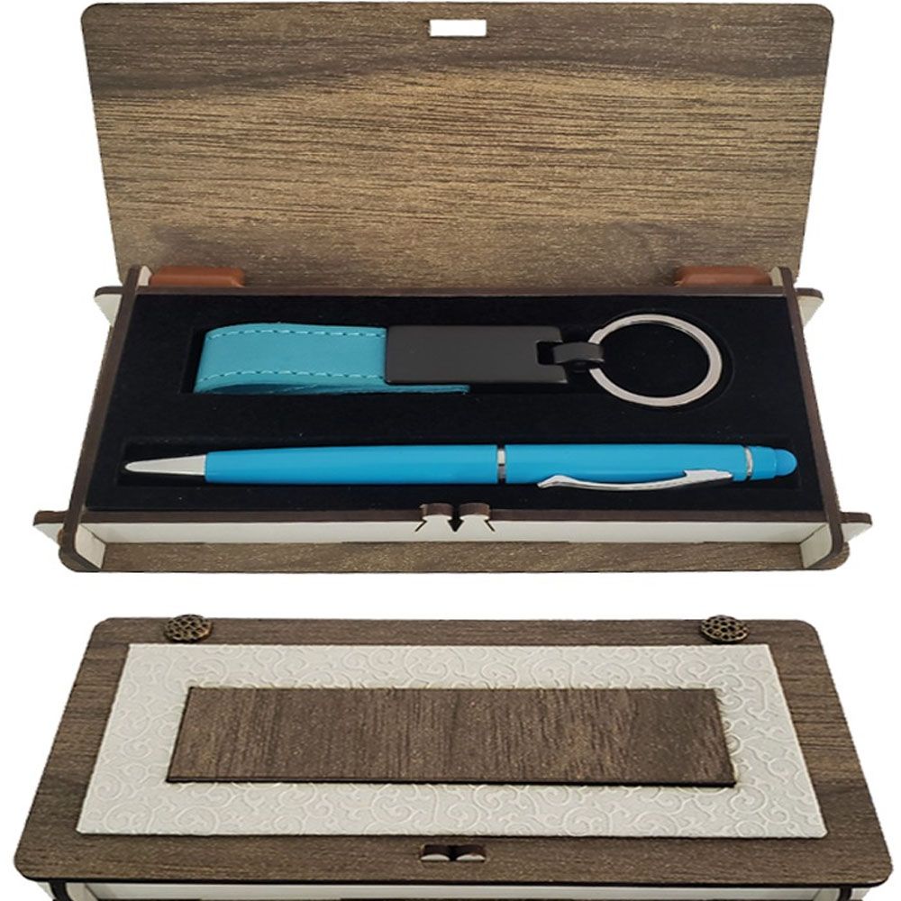 Mavi Kalem ve Anahtarlık Ahşap Kutulu Set