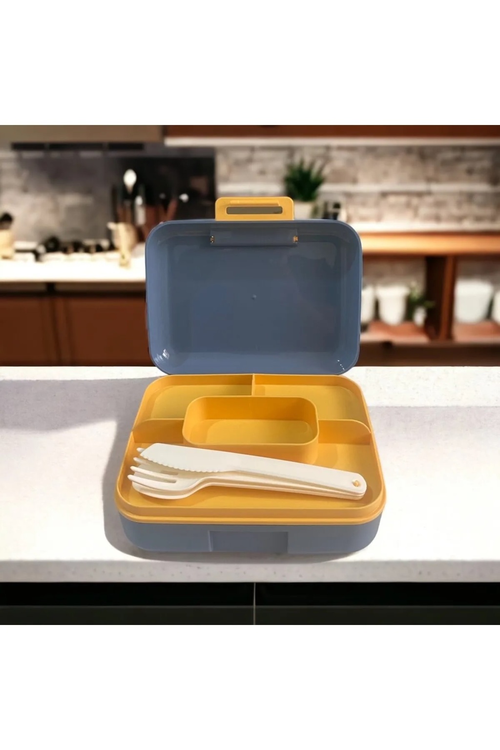 Meyve Suyu Bölmeli - Tabaklı Beslenme Kabı Diyet Kabı -Çatal Bıçak Kaşık Dahildir