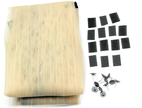 Poşet içinden çıkan çift tarafı yapışkanlı bantlarla tül kapıya üstten gergin şekilde yapıştırılır
