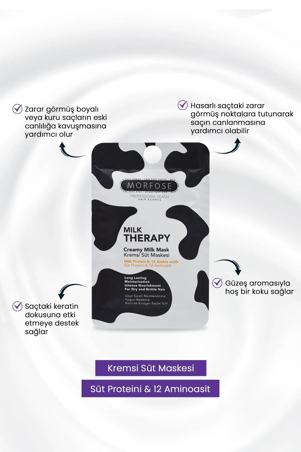 Milk Therapy Kremsi Süt Maskesi, başlıca 12 Amino Asit ve Süt proteiniyle saçınızı eski canlılığına kavuşturarak yoğun bakım sağlar. Saçlarınıza pürüzsüz bir görünüme kavuşmasına yardımcı olur.
