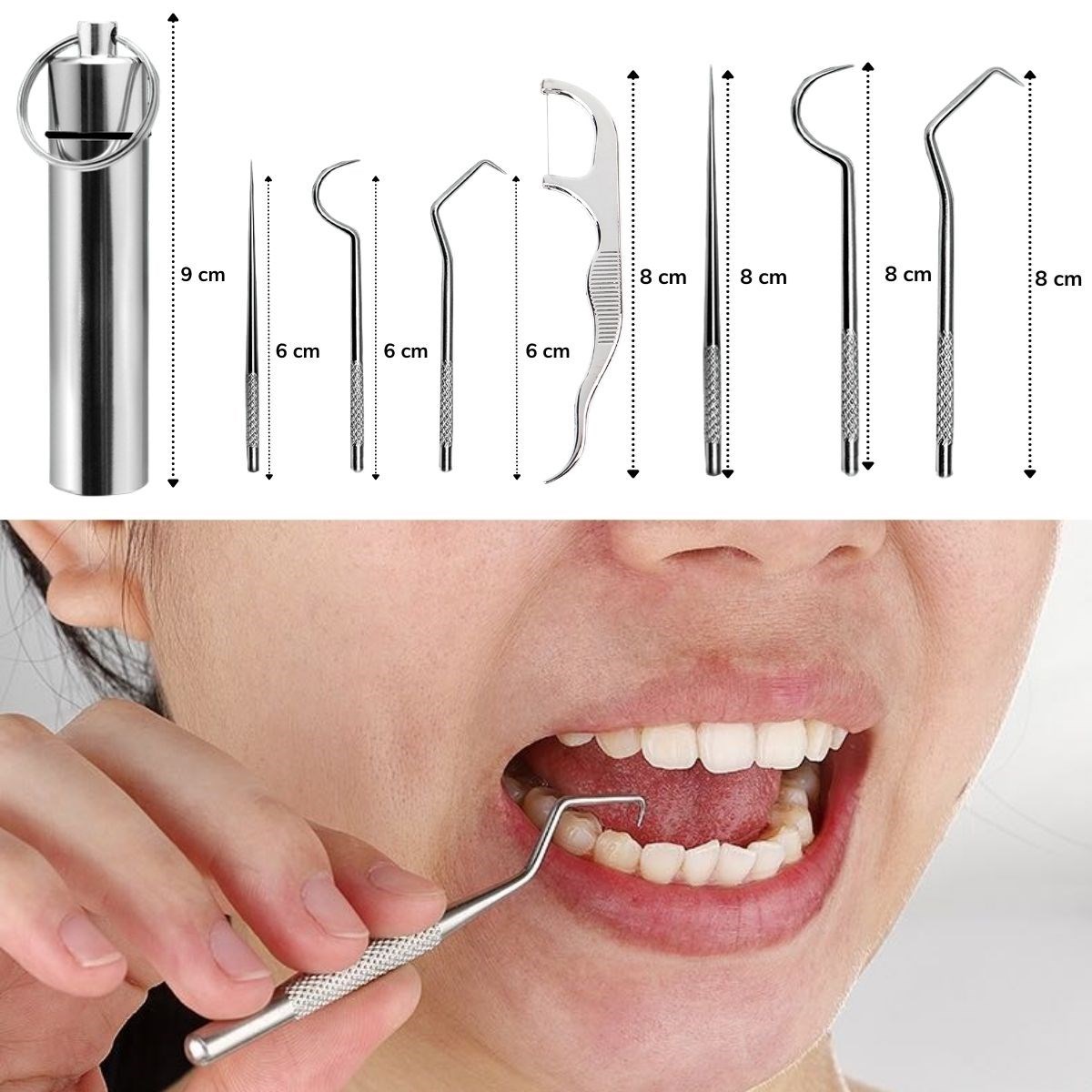 Enfeksiyon riskini en aza indirmek için yardımcı olur  7 Parça Paslanmaz Çelik  Ağız Diş Tartar Sökücü Temizlik Bakım Seti. Temelde oluşan tartar, bakteri, kalıntı sakız vs. gibi zor lekeleri kaldırarak dişlerinizin temiz kalmasını sağlar.