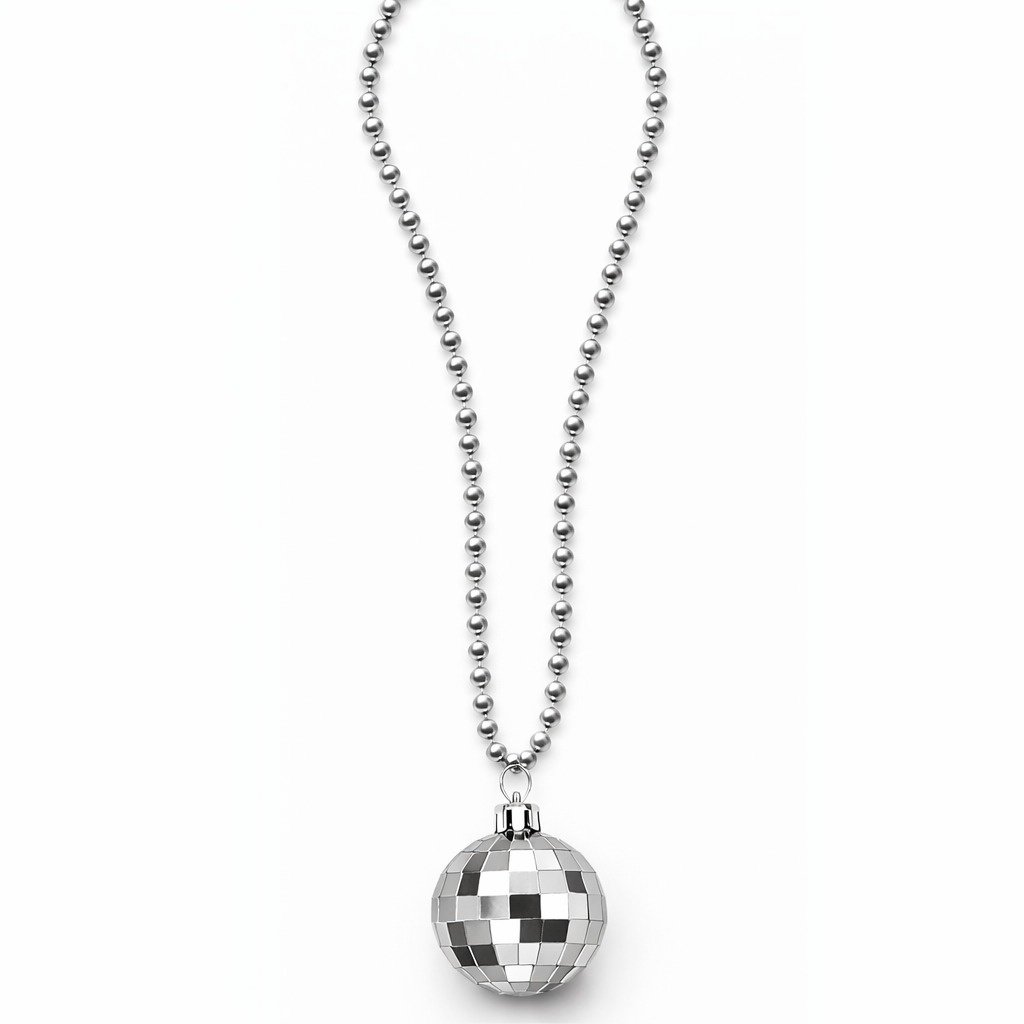 Kolye ucundaki disko topu tasarımı klasik dans pistlerinin enerjisini yansıtır ve retro tarz sevenler için eğlenceli bir görünüm oluşturur. Kostüm kombinlerini tamamlayan ve dikkat çeken bir parti aksesuarıdır.