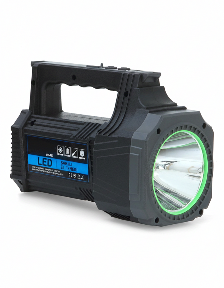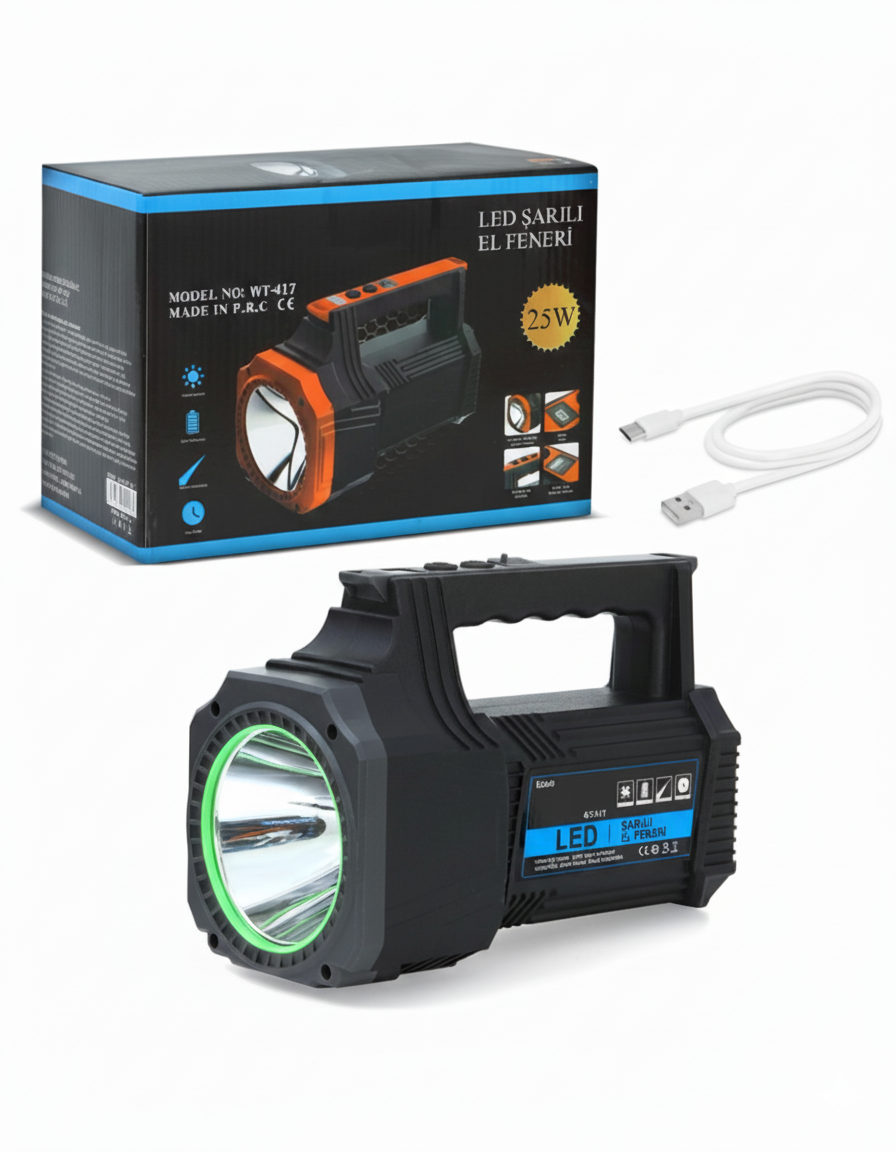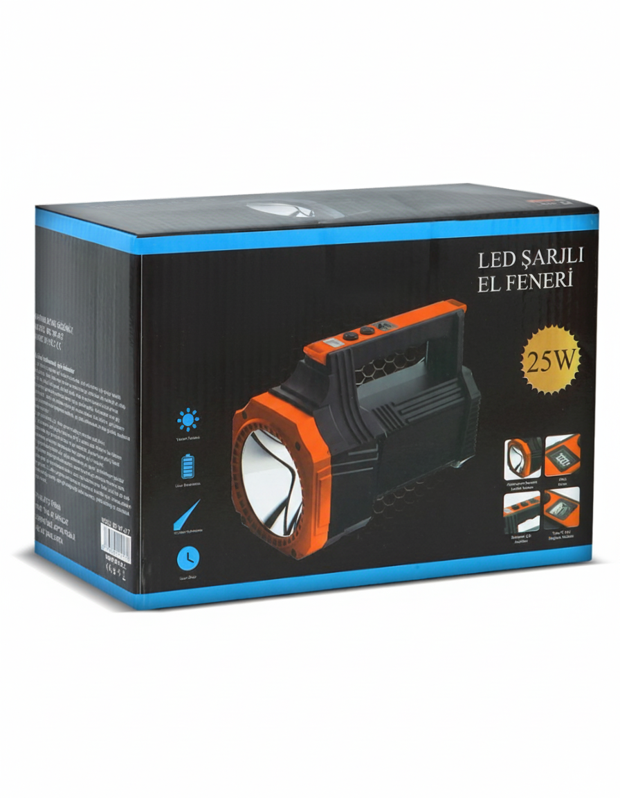 Karanlıkta hiçbir detayı kaçırmayın! 25W gücündeki şarjlı dev boy LED el feneri, yüksek parlaklık ve uzun menzil performansıyla geceyi gündüze çevirir.