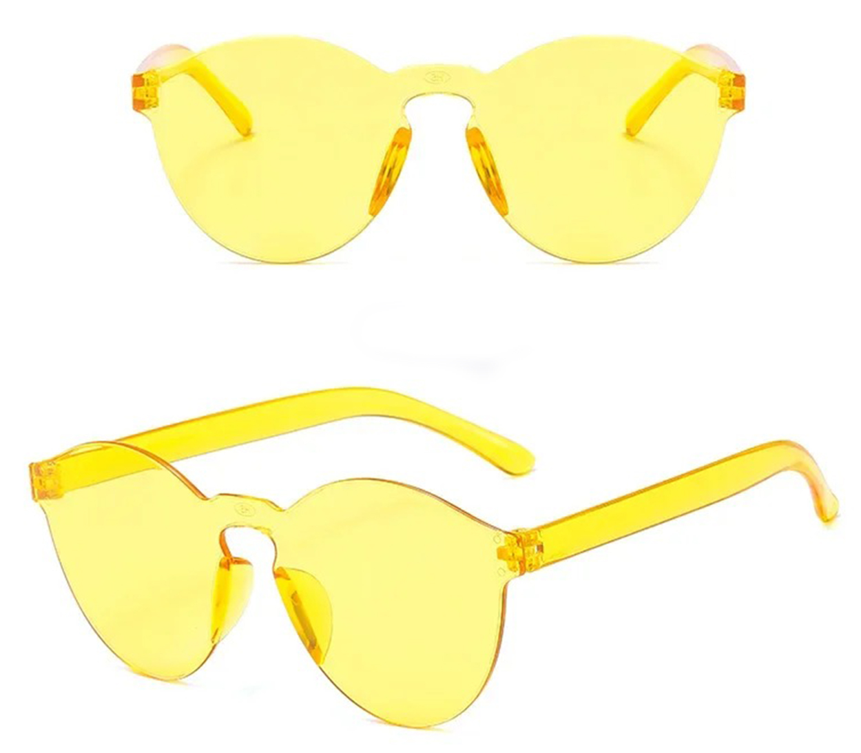 Dayanıklı sert mika malzemeden üretilen bu gözlük, 5x14 cm ölçüsüyle yüz hatlarına uyumlu olup retro ve modern tarzı bir arada sunar. Çerçevesiz tasarımıyla dikkat çekici bir aksesuar olan sarı şeffaf lens, enerji dolu ve iddialı bir stil yaratmak için idealdir.