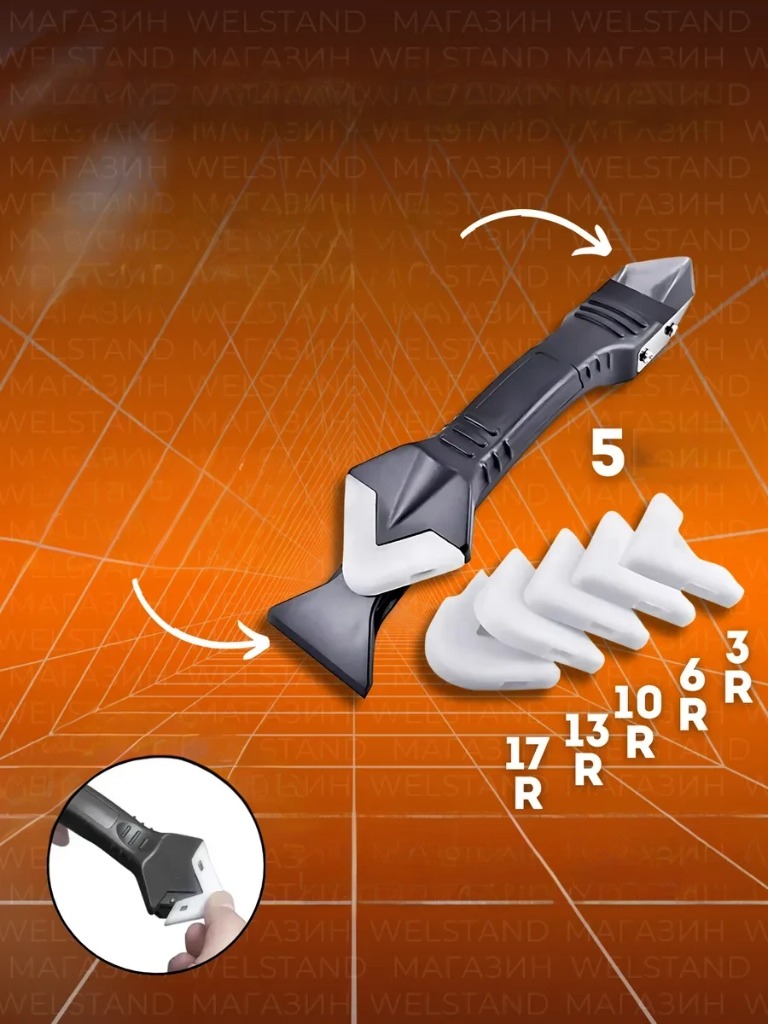 DEĞİŞTİRİLEBİLİR SİLİKON PEDLER: Farklı boyut ve yarıçapa sahip 5 adet değiştirilebilir silikon kafa ile birlikte gelir. Harç aleti kaymaz bir tasarıma sahiptir. Silikon sökücü aracı mutfak, duş, küvet, fayans, kapı, pencere, lavabo, derz dolgu bitirme ve daha fazlasında kullanılabilir. 3R, 6R, 10R, 13R ve 17R dahil olmak üzere farklı yarıçaplı kapaklara sahip 5 değiştirilebilir ped ile birlikte gelen Kaymaz sap ile tasarlanmıştır