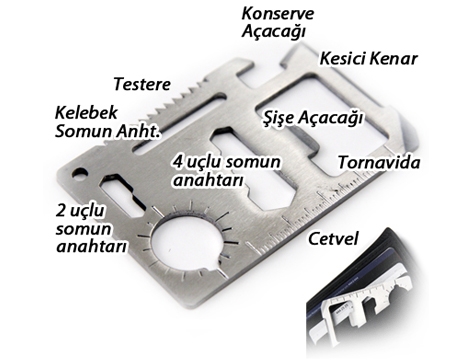 Sizi, kredi kartı boyutlarında bir usta ile tanıştırıyoruz. İster cüzdanınızda, ister cebinizde taşıyın. Tüm işlerinizde kullanın.Özel paslanmaz çelikten üretilmiştir. Özel kılıfı sayesinde cebinizde bile taşıyabilirsiniz.11 farklı fonksiyonu yerine getirebilmektedir.