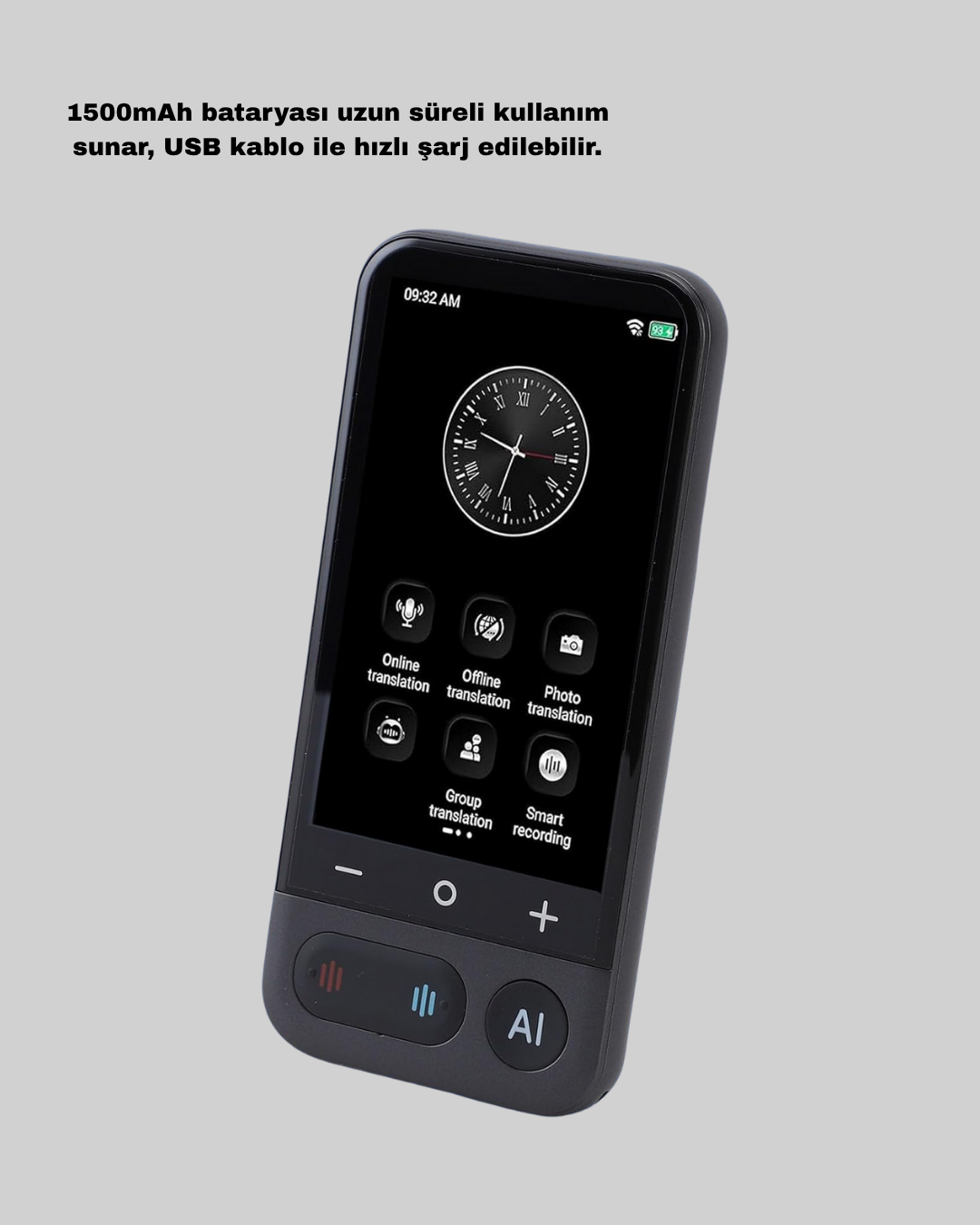 Farklı diller konuşan insanlarla iletişim kurmak artık çok kolay!Bu akıllı tercüme cihazı, 139 çevrimiçi ve 17 çevrimdışı dil desteği ile hem iş hem seyahat hem de eğitim alanında mükemmel bir yardımcıdır.Yalnızca bir tuşla anında sesli veya metin çevirisi yapabilir, konuşmaları yüksek doğruluk oranıyla anlayabilirsiniz.4.0 inç dokunmatik ekran, kullanıcıya kolay kullanım sunar; parlak IPS panel, yazıları ve simgeleri net bir şekilde gösterir.Yapay zekâ destekli çeviri algoritması, telaffuzları analiz ederek anlam bütünlüğüyle sonuç verir.Ayrıca fotoğraf çevirisi özelliği sayesinde menü, afiş veya belgelerdeki metinleri saniyeler içinde çevirebilirsiniz.1500mAh bataryası uzun ömürlü kullanım sağlarken, hızlı şarj teknolojisi ile kısa sürede yeniden kullanıma hazır hale gelir.Dayanıklı alüminyum gövdesi darbelere ve çizilmelere karşı koruma sağlar.Android ve iOS sistemleriyle uyumluluğu, çok yönlü bağlantı esnekliği sunar.Kompakt boyutu ve hafifliği sayesinde cebinizde taşıyabilir, toplantılarda, gezilerde veya eğitim ortamlarında anında çeviri yapabilirsiniz.Dünya ile iletişim kurmak hiç bu kadar pratik ve keyifli olmamıştı!