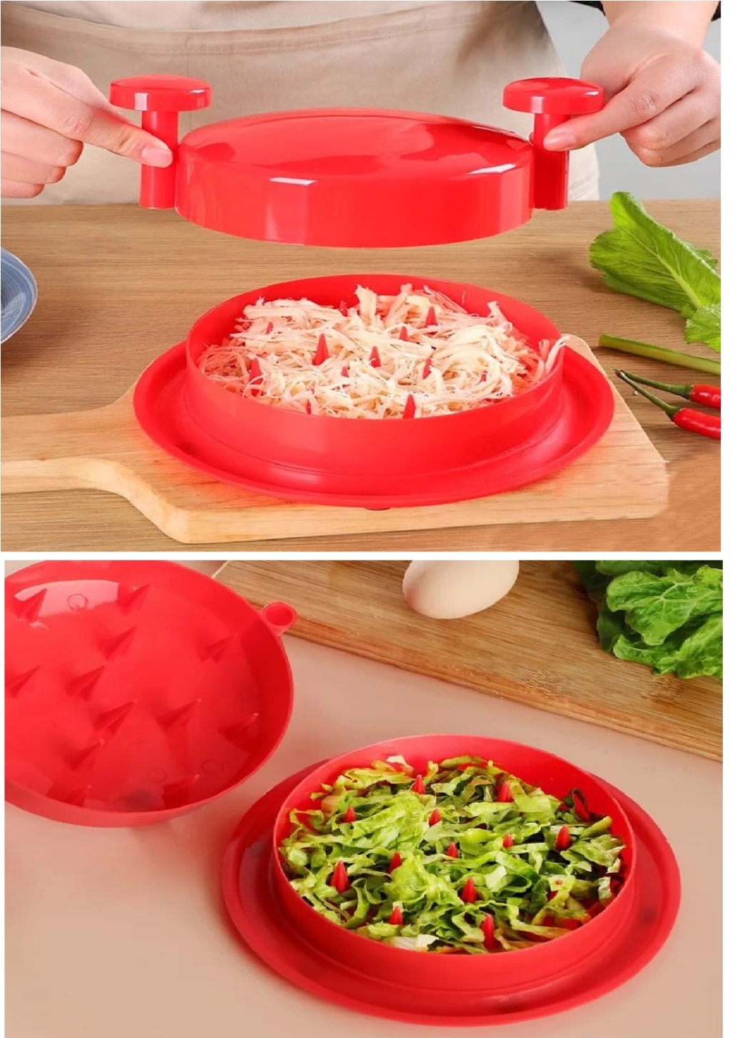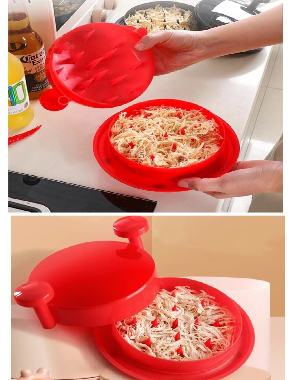 Bu pratik alet, tavuk, patlıcan, biber ve daha fazlasını hızlıca parçalamanıza yardımcı olur. Hızlı ve Etkili Parçalama Tavuk, patlıcan veya biberi parçalamak artık zahmetli bir iş olmaktan çıkıyor.