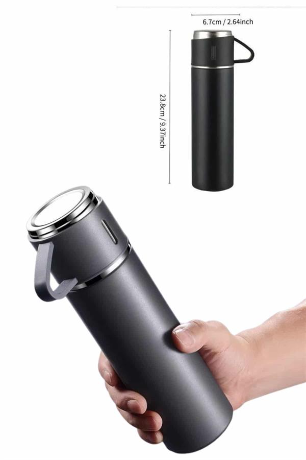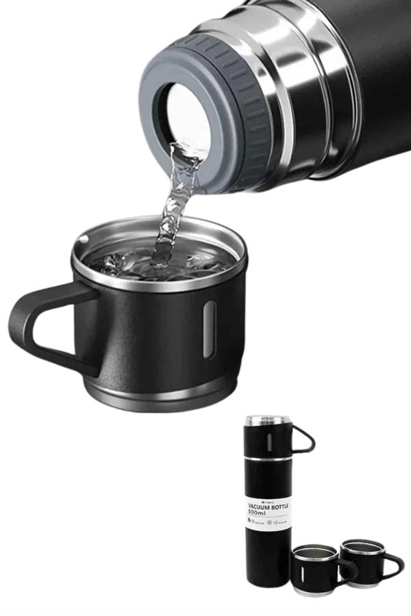 Termos Paslanmaz Çelik Termos Siyah Renk 3 Bardaklı Termos Seti